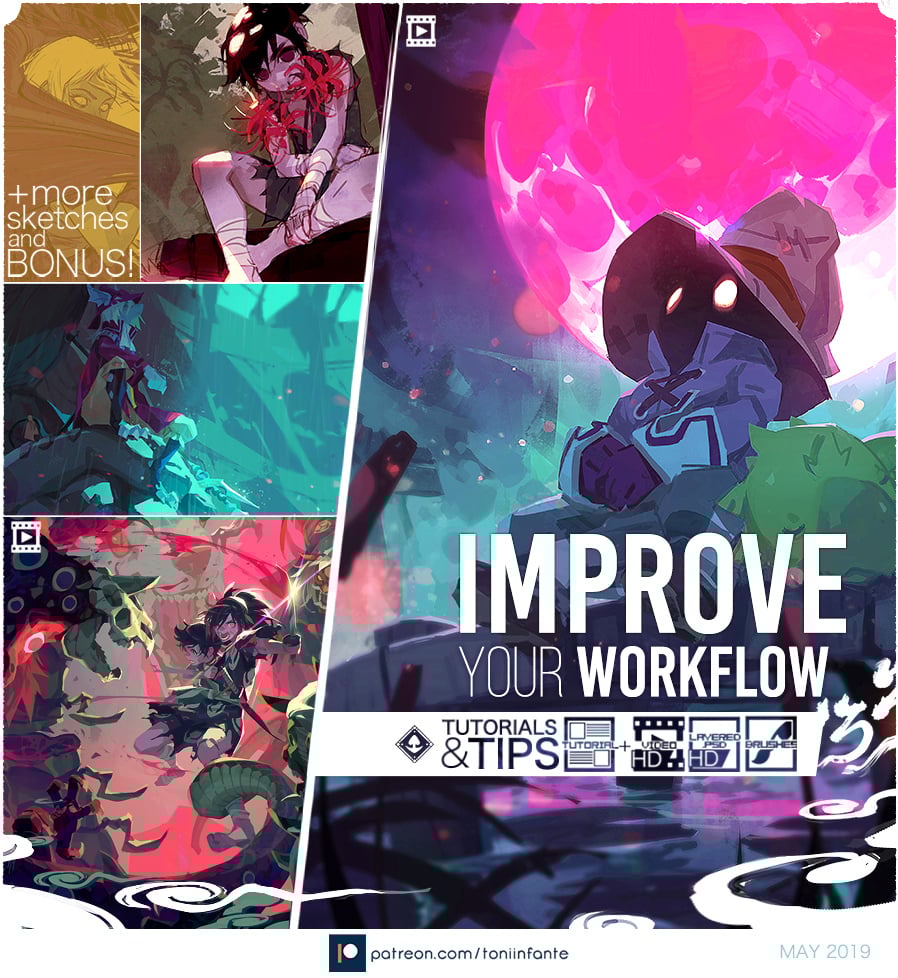 - Improve your Workflow: Tips and insight on my process that hopefully can help you to improve your own workflow. Here I talk about my work space, my source of inspirations and resources, my way to arrange references, and more.